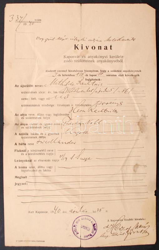 Leírás: 1940 Izraelita születési anyakönyvi kivonat Herzl kaposvári főrabbi aláírásával