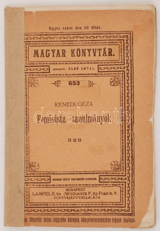 Leírás: Kenedi Géza: Feminista tanulmányok. Magyar Könyvtár. Szerkeszti Radó Antal. Budapest, é.n., Lampel. Kiadói papír kötésben.
