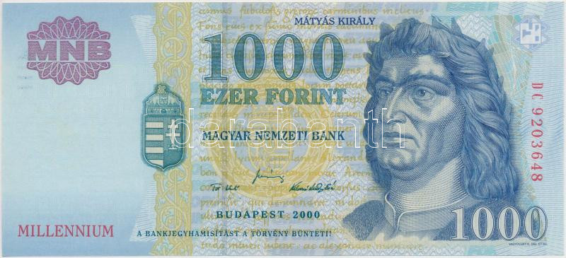 2000. 1000Ft "DC" "Millennium" T:I https://www.darabanth.com/hu/249-Gyorsarveres/249.0/Numizmatika/Magyar-bankjegyek~6/2000-1000Ft-DC-Millennium-TI~II1188707