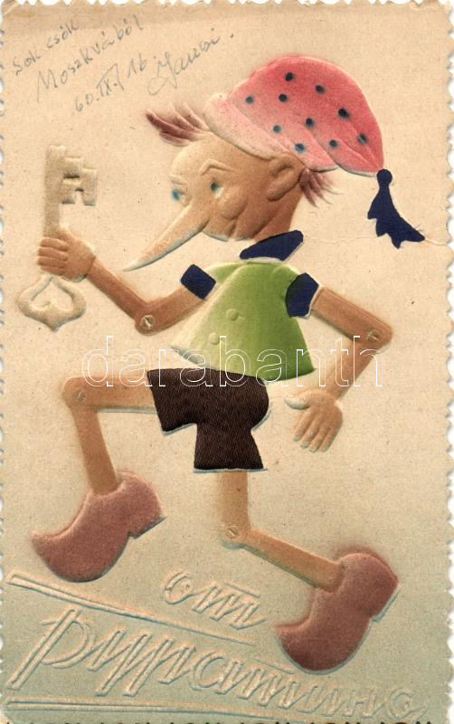 Buratino, az orosz Pinokkio, dombornyomott textildíszítésű modern képe... https://www.darabanth.com/hu/25-Nagyaukcio/25.1/Motivum-kepeslapok/Disney~9883/Buratino-az-orosz-Pinokkio-dombornyomott-textildiszitesu-modern-kepeslap-the-Russian-Pinocc~II1378795