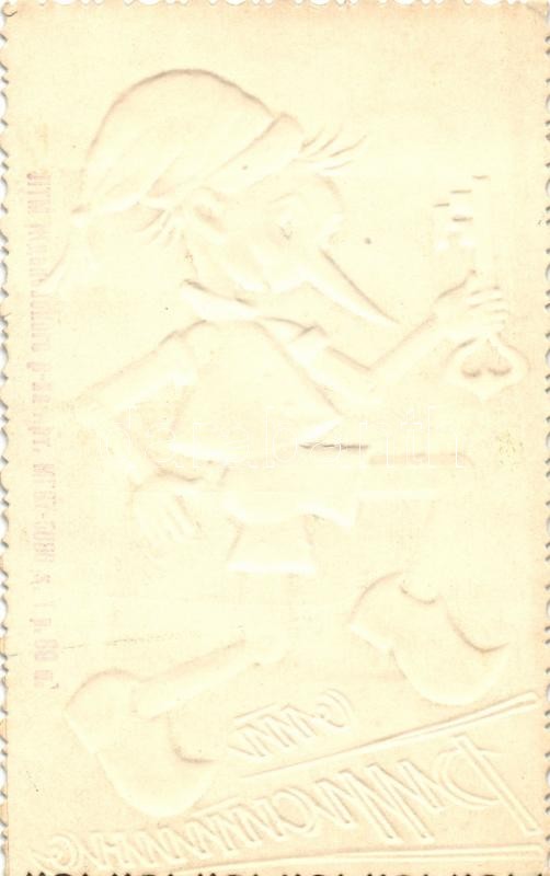 Leírás: Buratino, az orosz Pinokkio, dombornyomott textildíszítésű modern képeslap / the Russian Pinocchio, Emb. mechanical modern card (non PC)