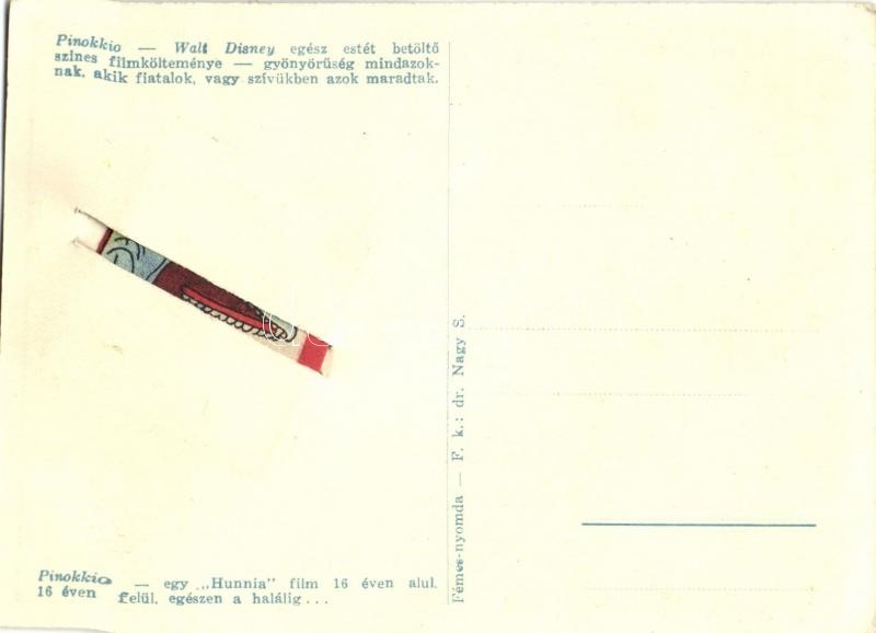Pinokkio - Walt Disney óriásfilmje a Hunnia Film forgalmazásában. Színes füzetke melléklettel / Hungarian Disney film advertisement with colour booklet included