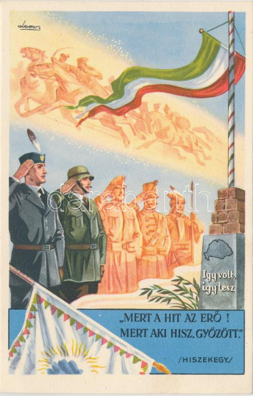 Mert a hit az erő, mert aki hisz, győzött; Hiszekegy, kiadja a Ereklyé... https://www.darabanth.com/hu/25-Nagyaukcio/25.1/Motivum-kepeslapok/Irredenta~9881/Mert-a-hit-az-ero-mert-aki-hisz-gyozott-Hiszekegy-kiadja-a-Ereklyes-Orszagzaszlo-Nagybizo~II1026915
