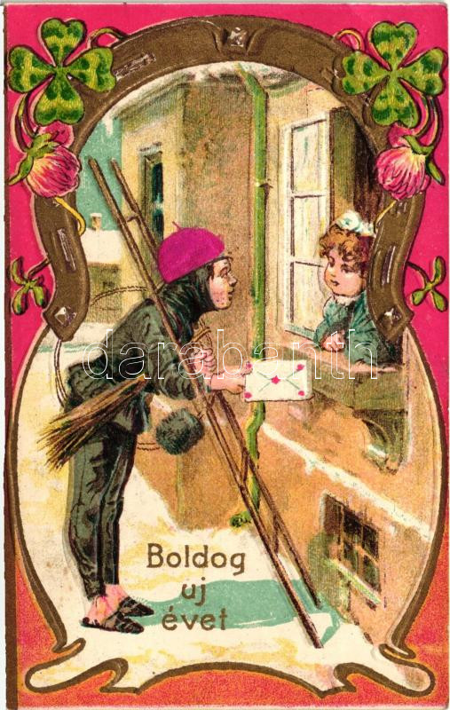 Leírás: Újév / New Year, chimney sweep Emb. litho
