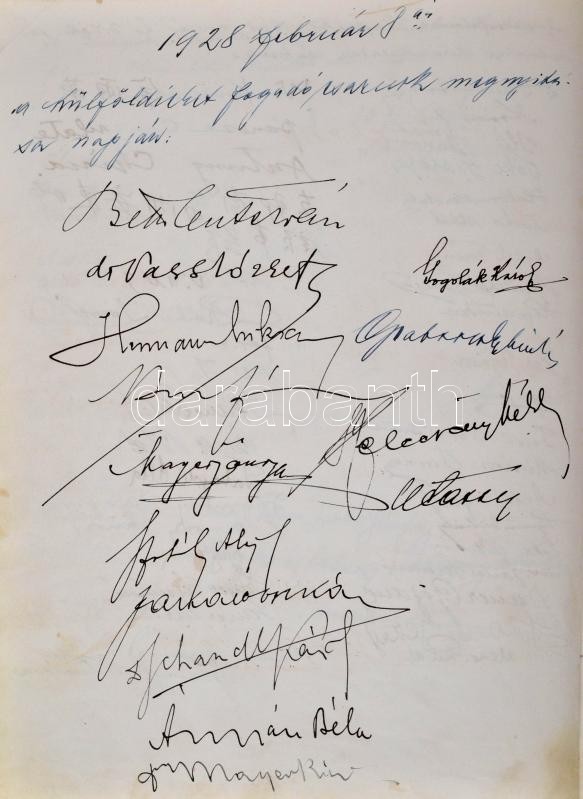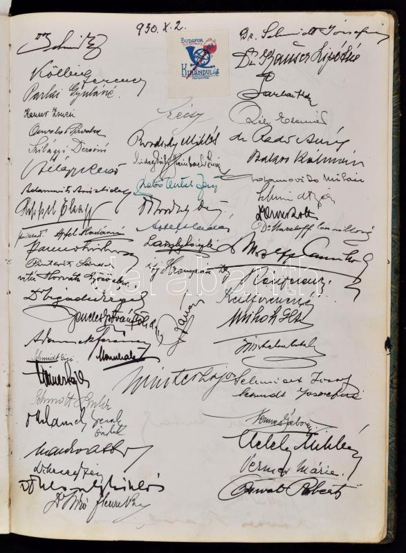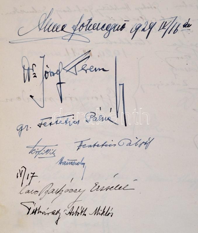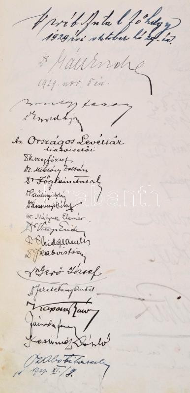 A budafoki Magyar Királyi Állami Pincegazdaság vendégkönyve, 1926-1930. Rengeteg aláírással. Köztük több híres és ismert ember kézírásával. Pl: Mayer János (1871-1955) földművelésügyi miniszter, Behtlen István (1874-1946) miniszterelnök, Walko Lajos (1880-1954) politikus, miniszter, Vass József (1877-1930) politikus, egyházfi. 1927. június 14.-én a Magyar Királyi Opera tagjai tettek látogatást itt. Köztük: Budanovits Mária (1884-1976), Walter Rózsi (1901-1974), Tamássy Miklós (1881-1933), Makoldy Némethy Ella (1895-1961) és férje Makoldy József (1890-?) festőművész, grafikus és valamint még sokan mások is. 1929. április 16-án József Ferenc főherceg (1895-1957), és felesége Anna főhercegnő (1903-1976), valamint kísérete Festetics Pál (1858-1930) és felesége látogatott el ide. 1929. június 6.-án Horthy István (1904-1942) és magsasrangú vendégei, Nikolaus Erbgroßherzog von Oldenburg (1897-1970) és felesége, Helene (1899-1948), valamint kísérete látogattak el ide. Később az Országos Levéltár tisztviselői látogattak el ide, 1929 november 5.-én. Köztük Mályusz Elemér (1898-1989). Rendszeresek voltak az iskolai, céges, különféle szervezetek látogatásai, amelyek rendre bejegyezték magukat. A könyvben még számos aláírás és bejegyzés található, amely felfedezésre vár. Kopottas egészvászon kötés, 190 p.