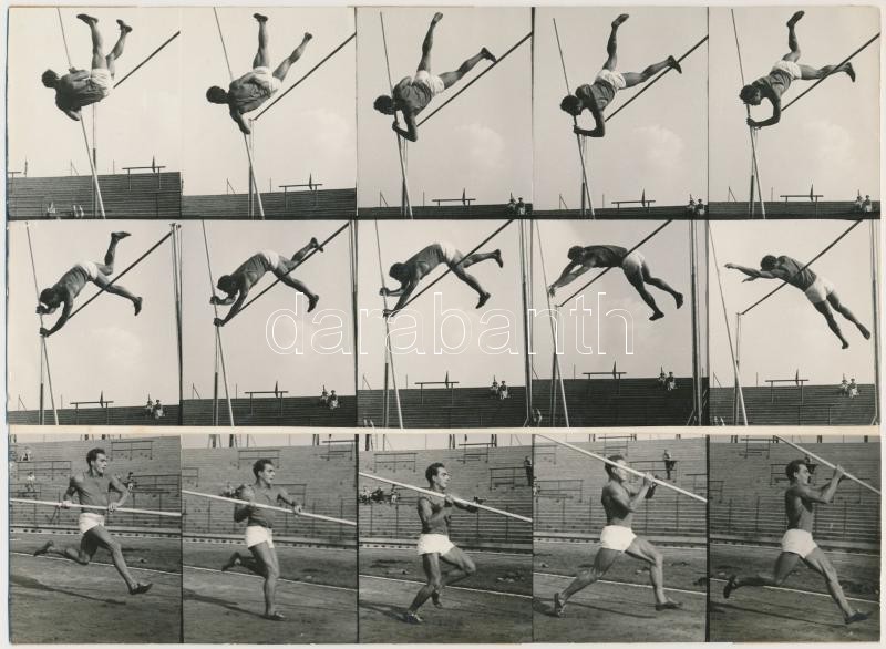 Leírás: cca 1940 Rúdugró, Kozák Lajos fotósorozata, 30 db 5,5x5,5 cm, a teljes fotó 34x24 cm / Pole vaulter, 30 photos of Lajos Kozák, 5,5x5,5 cm