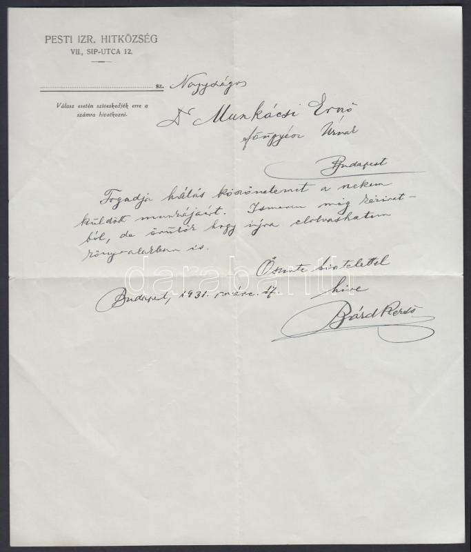 1931 A Pesti Izraelita Hitközség, Bárd Rezső levele Munkácsi Ernő (1896-1950) ügyvéd, jogi író. A Pesti Izraelita Hitközség, majd a Zsidó Tanács főtitkárának.