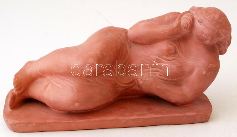 Leírás: Rieger Tibor (1940-): Csigaházat hallgató lány. Terrakotta, jelzett, hibátlan, m:12 cm, h:22 cm
