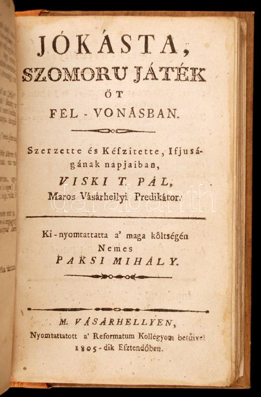 Viski T. Pál: Ravaszdi, víg érzékeny játék 5 felvonásokban, Marosvásárhely, 1805. A Református Kollegyom betűivel. 88p. egy-két oldal sérült.+ hozzákötve :