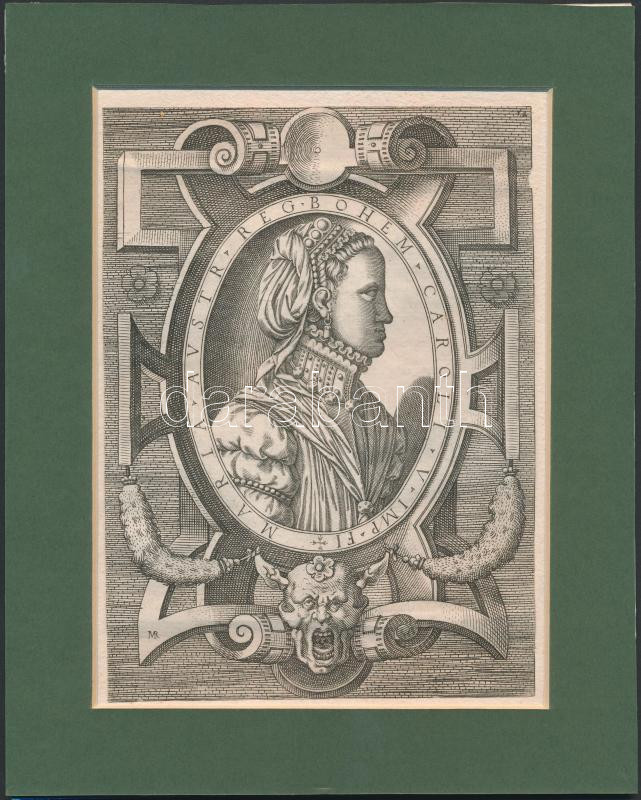 cca 1568 Martino Rota (1520 k. - 1583): Habsburg Mária (1528-1603) magyar királyné portréja, rézmetszet, papír, jelzett, az "Imagines quorundam principum et illustrium virorum" c. munkából (Velence, 1568), paszpartuban, nagyon apró sérüléssel, 18,5×13,5 cm / cca 1568 Martino Rota (cca 1520-1583): Portrait of Maria of Austria (1528-1603) Queen Consort of Hungary, copper etching, on paper, from the "Imagines quorundam principum et illustrium virorum" (Venice, 1568), in passepartout, with a very small damage, 18,5×13,5 cm