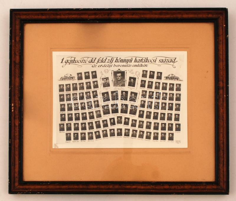 1940 1. gépkocsizó dd.feld.zászlóalj könnyű harckocsi század tablóképe az erdélyi bevonulás emlékére, kartonra kasírozott fotó üvegezett keretben, 18x23 cm