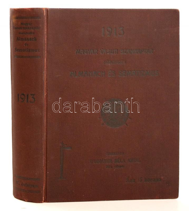 1913 Magyar vasúti szaknaptár. Közlekedési almanach és sematizmus. Kilenczedik évfolyam. Szerk.: Wodianer Béla Antal. 736p . Számos reklámoldallal. Kiadói egészvászon-kötésben.