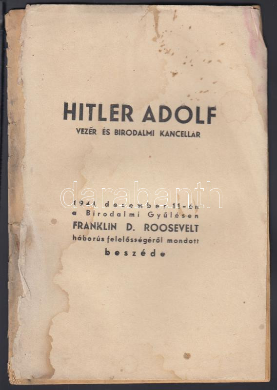 1941 Hungarian translation of the speech of Adolf Hitler held on 11 December 1941 at the National Assembly, in a worn out condition, 31 p.