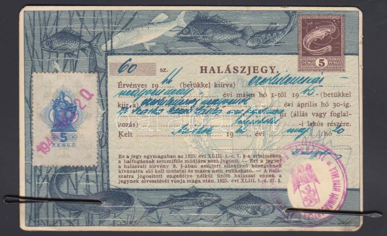 1944 Halászjegy. Litho, okmánybélyegekkel, horoggal átszúrva / Fishin... https://www.darabanth.com/hu/25-Nagyaukcio/25.1/Mutargy-papirregiseg/Okmanyok~10085/1944-Halaszjegy-Litho-okmanybelyegekkel-horoggal-atszurva--Fishing-ticket~II1378595
