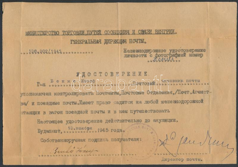 1945 Utazási igazolás orosz nyelven postai alkalmazott részére / Trave... https://www.darabanth.com/hu/25-Nagyaukcio/25.1/Mutargy-papirregiseg/Okmanyok~10085/1945-Utazasi-igazolas-orosz-nyelven-postai-alkalmazott-reszere-Travel-pass-Russian-language-fo~II1371087