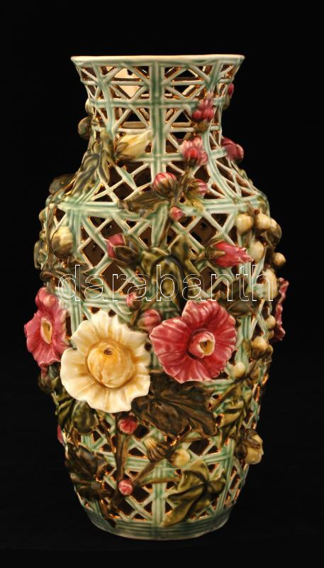 Zsolnay díszváza, kézzel festett porcelánfajansz, egész testen áttört és domború virágmintás díszítéssel, jelzett (TJM cca 1890), apró tűzrepedésekkel, formaszám:3967, m:31 cm