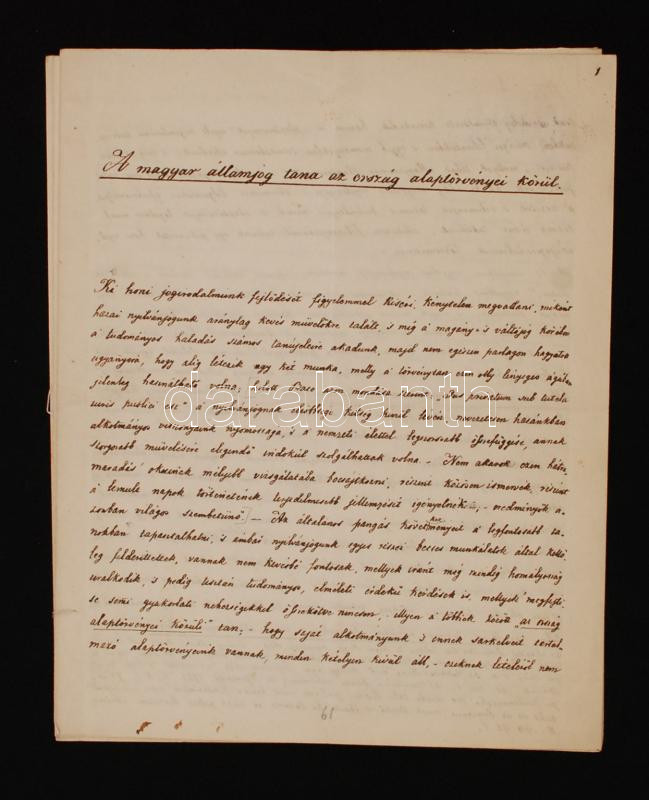 1847 Pauler Tivadar (1816-1886) jogász "A magyar államjog tana az ország alaptörvényei körül" c. írásának kézirata, kisebb javításokkal, elváló tűzött kötésben, 16 p. / 1847 A manuscript of a paper written by Hungarian jurist Tivadar Pauler (1816-1886) with small corrections, 16 p.
