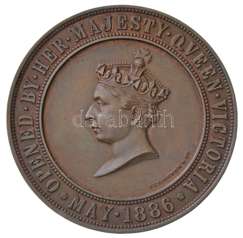 Great Britain / Liverpool 1886. "International Exhibition of Navigation, Travelling, Commerce & Manufactures" Cu medal with makers mark "ELKINGTON & CO." in slightly damaged case. "OPENED BY HER MAJESTY QVEEN VICTORIA - MAY 1886 / INTERNATIONAL EXHIBITION OF NAVIGATION TRAVELLING COMMERCE & MANUFACTURES - LIVERPOOL 1886 - SIR DAVID RADCLIFFE MAYOR CHAIRMAN" (58,29g/51mm) C:AU,XF small edge error