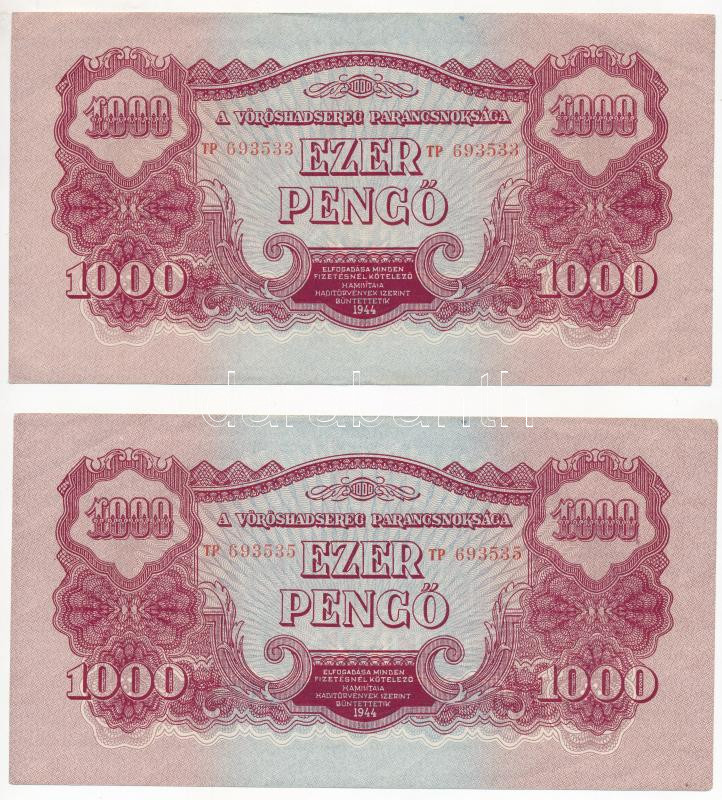Leírás: 1944. 1000P "A Vöröshadsereg Parancsnoksága" (2x) egyugrású sorszámokkal T:II /