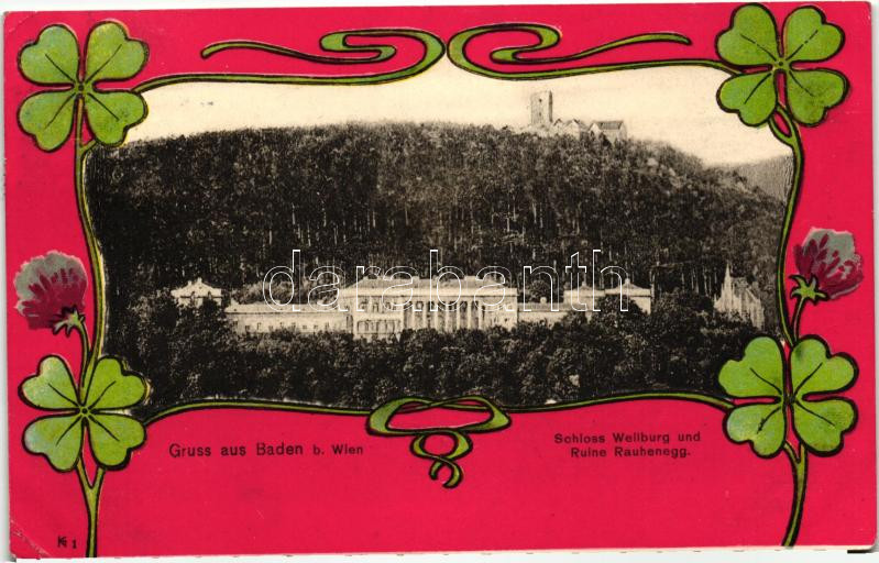 Baden bei Wien, Schloss Wellburg, Ruine Rauhenegg, clover Art Nouveau ... https://www.darabanth.com/hu/25-Nagyaukcio/25.1/Varoskepes-lapok/Ausztria~9821/Baden-bei-Wien-Schloss-Wellburg-Ruine-Rauhenegg-clover-Art-Nouveau-litho-EK~II1378615