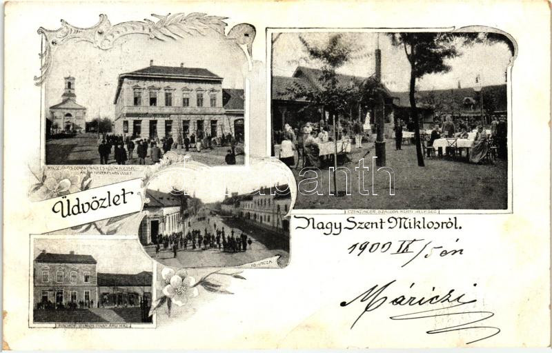 Leírás: Nagyszentmiklós, Sannicolau Mare; Mausz János vegyeskereskedése, Fischof Vilmos divatáruháza, Czenzinger szálloda kerthelyisége / shops, multi-view; floral