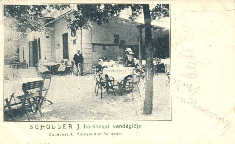 Budapest II. Schüller J. hárshegyi vendéglője, Hidegkúti út 84. https://www.darabanth.com/hu/25-Nagyaukcio/25.1/Varoskepes-lapok/Magyarorszag~9810/Budapest-II-Schuller-J-harshegyi-vendegloje-Hidegkuti-ut-84~II1362528