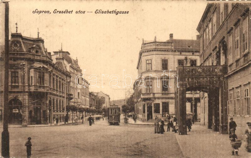 Sopron, Erzsébet utca, villamos, Piri Dániel kiadása https://www.darabanth.com/hu/25-Nagyaukcio/25.1/Varoskepes-lapok/Magyarorszag~9810/Sopron-Erzsebet-utca-villamos-Piri-Daniel-kiadasa~II1375581