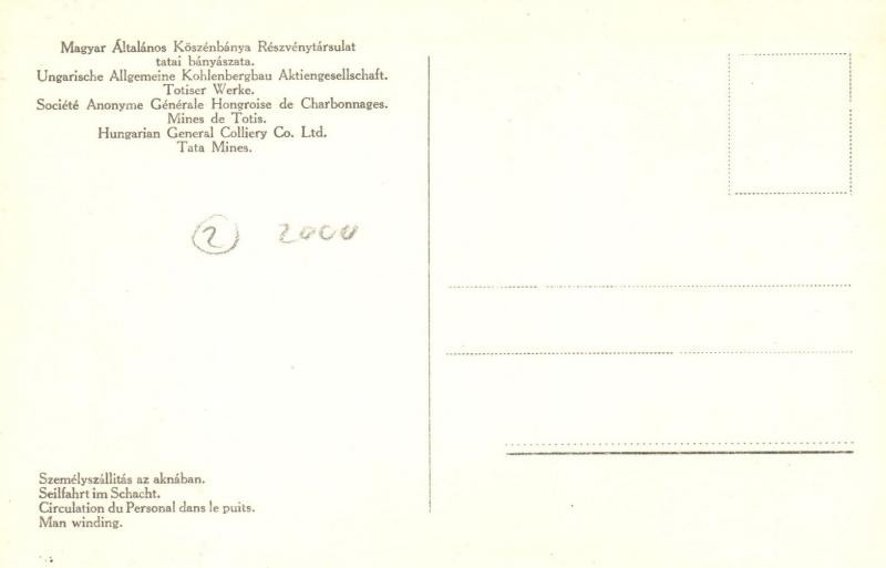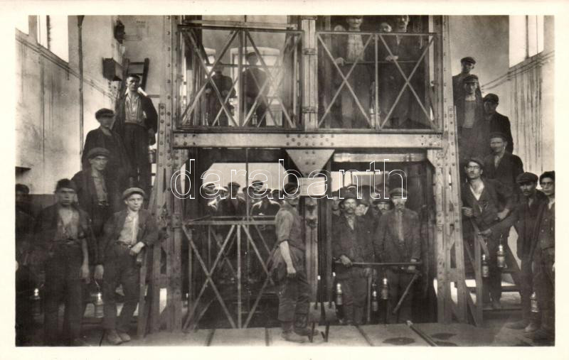Leírás: Tata, a Magyar Általános Kőszénbánya Részvénytársulat tatai bányászata, személyszállítás az aknában