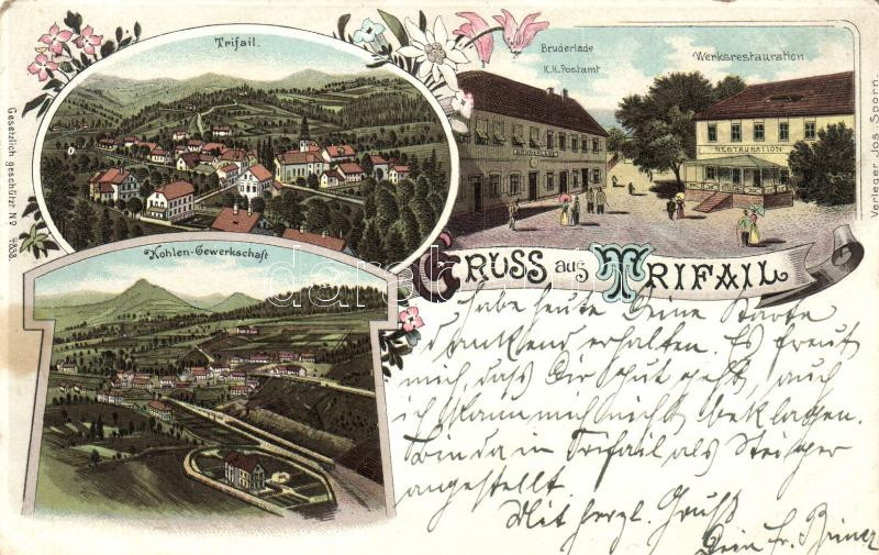 Leírás: Trbovlje, Trifail; Kohlen-Gewerkschaft, Bruderlade K.K. Postamt, Werksrestauration / mine area 'Gruss aus...' litho