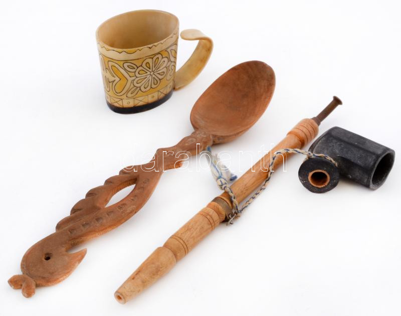 Leírás: Vegyes bolha tétel: kerámia pipa fából készült szárral, díszesen faragott fából készült kanál, díszes csont pohárka