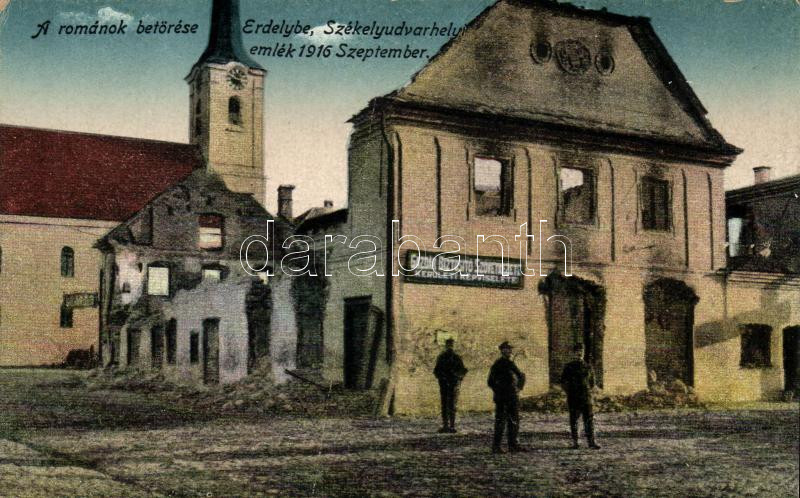 Leírás: 1916 Székelyudvarhely, románok betörése, lerombolt épületek, Gazdák Biztosító Szövetkezete / ivansion of the Romanians, destroyed buildings, cooperative