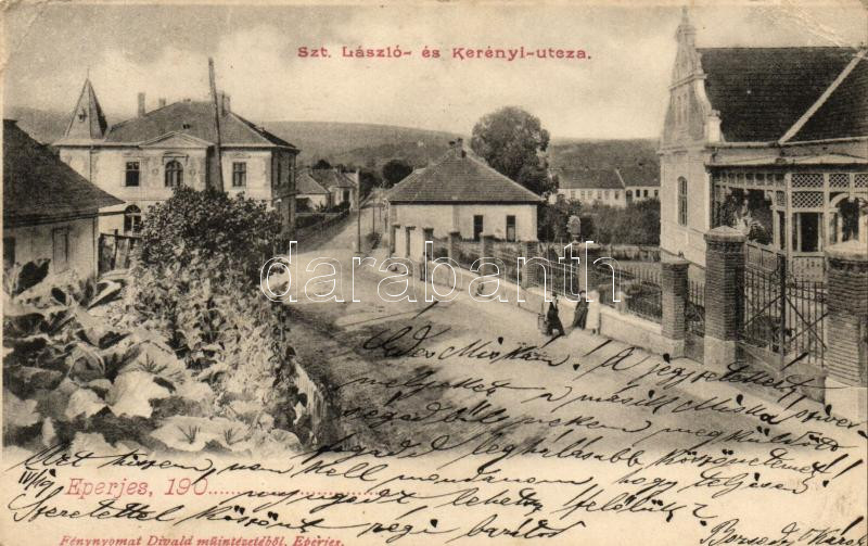 Eperjes, Szent László és Kerényi utca; Divald / streets (EB) https://www.darabanth.com/hu/250-Gyorsarveres/250.0/Kepeslapok/Felvidek~200008/Eperjes-Szent-Laszlo-es-Kerenyi-utca-Divald-streets-EB~II1200651