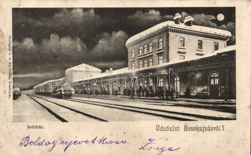 Leírás: Érsekújvár, Nové Zámky; indóház, vasútállomás télen, kiadja Conlegner J. és fia / railway station, winter (fl)