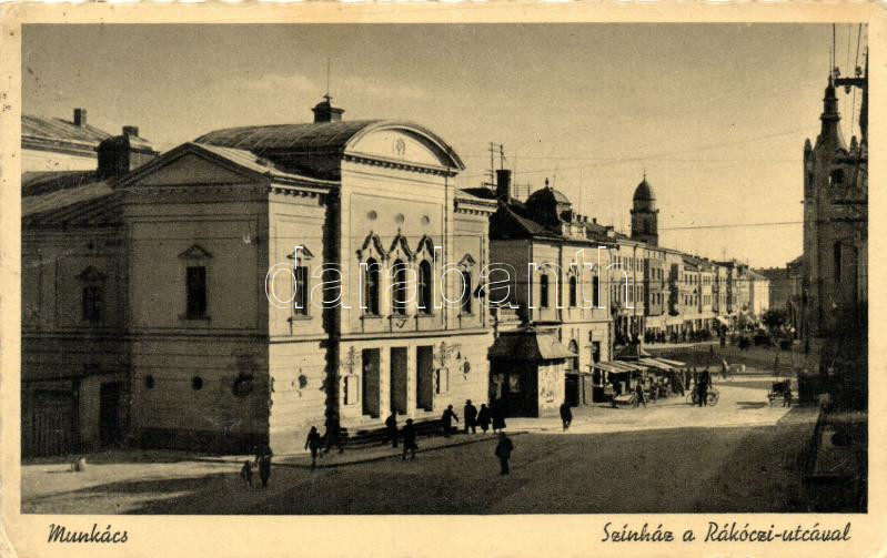 Munkács, Mukacseve; Színház, Rákóczi utca / theatre, street (EK) https://www.darabanth.com/hu/250-Gyorsarveres/250.0/Kepeslapok/Karpatalja~200009/Munkacs-Mukacseve-Szinhaz-Rakoczi-utca-theatre-street-EK~II1202425