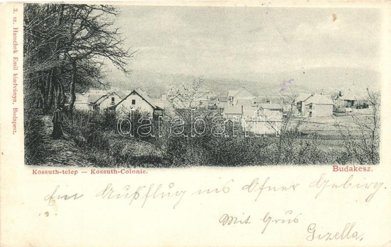 1899 Budakeszi, Kossuth-telep, kiadja Hatschek Emil (EK) https://www.darabanth.com/hu/250-Gyorsarveres/250.0/Kepeslapok/Magyarorszag~200006/1899-Budakeszi-Kossuth-telep-kiadja-Hatschek-Emil-EK~II1205283
