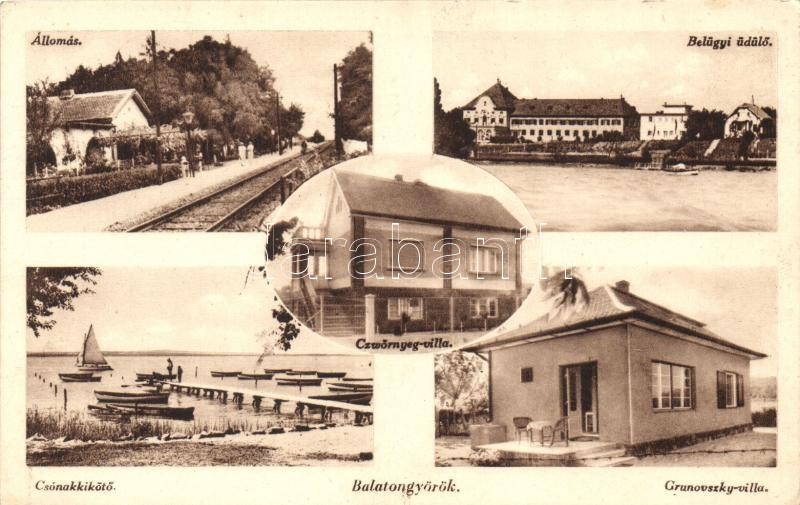 Leírás: Balatongyörök, vasútállomás, Belügyi üdülő, Grunovszky- és Cswörnyeg-villák, csónakkikötő