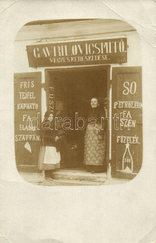 Ismeretlen város, Gavrilovics Mitó vegyeskereskedése (EB) https://www.darabanth.com/hu/250-Gyorsarveres/250.0/Kepeslapok/Magyarorszag~200006/Ismeretlen-varos-Gavrilovics-Mito-vegyeskereskedese-EB~II1204146