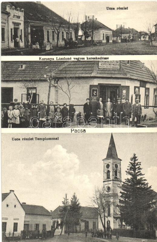 Leírás: Pacsa, Koronya Lászlóné vegyeskereskedése, templom, utca, Kálmán fényképész kiadása