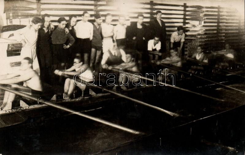Leírás: 1927 Ferencváros (Fradi) téli evezős edzőterme, evezősök edzés közben / Hungarian rowing team during training, photo