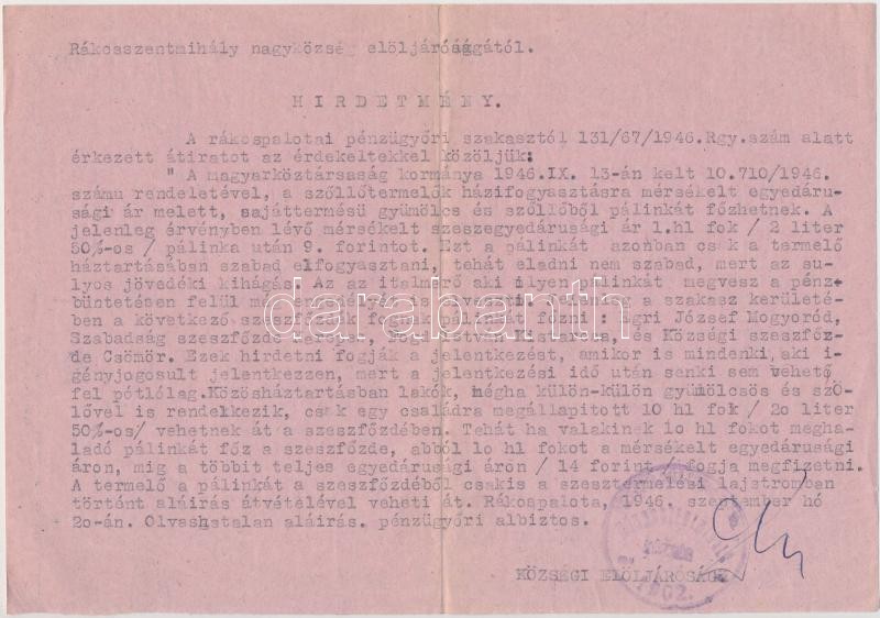 Leírás: 1946. "Állami kenyérpótjegy testi munkás részére" hátoldalán hirdetmény pálinkafőzésről a "Rákosszentmihály nagyközség elöljáróságától" T:II,II-