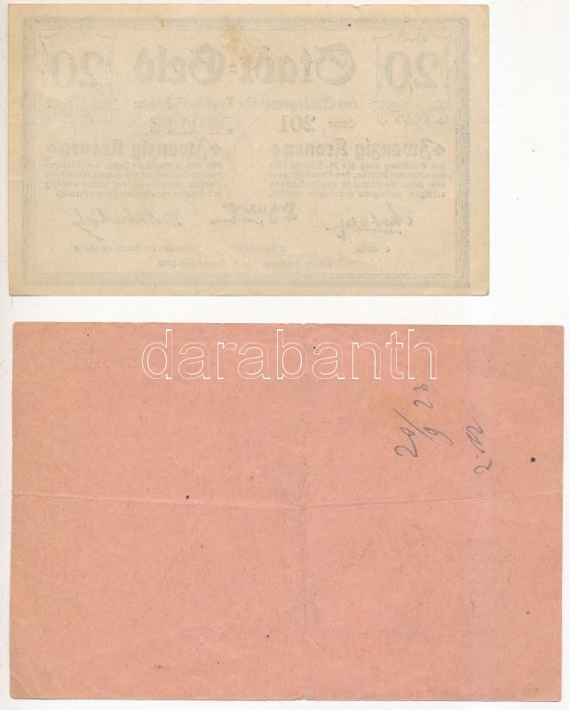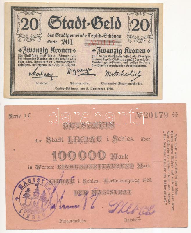 Austria / Teplitz-Schönau 1918. 20 Kronen + Germany / Weimar Republic / Liebau 1923. 100.000 Mark with stamp C:F