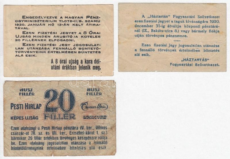 Leírás: Budapest 1919. 20f "8 Órai Újság" + 1920. 20f "Háztartás Fogyasztási Szövetkezet" fizetési jegy + 20f "Pesti Hírlap" T:III,III-