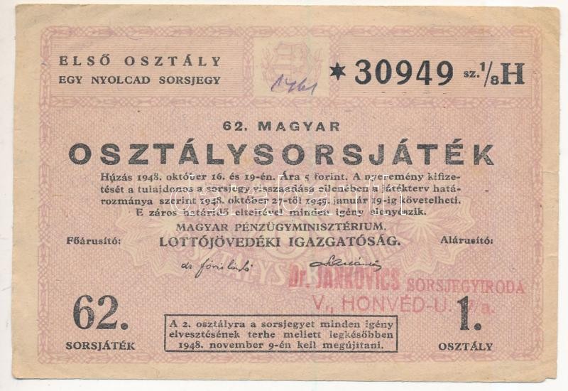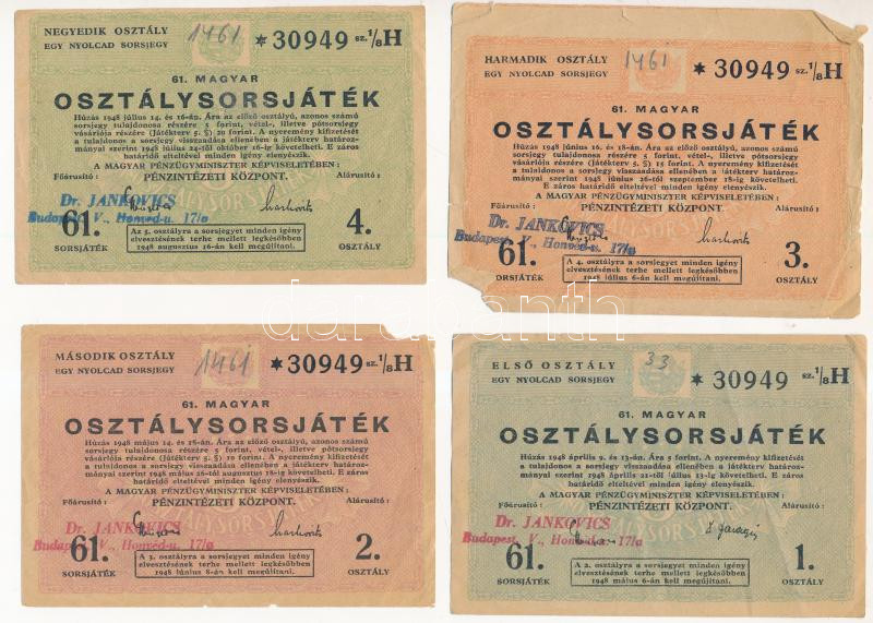 1948. "61. és 62. Magyar Osztálysorsjáték" (5x) első, második, harmadik és negyedik osztály sorsjegyei, mindegyik "Dr. Jankovics Sorsjegyiroda V., Honvéd-u. 17/a" felülbélyegzéssel T:III