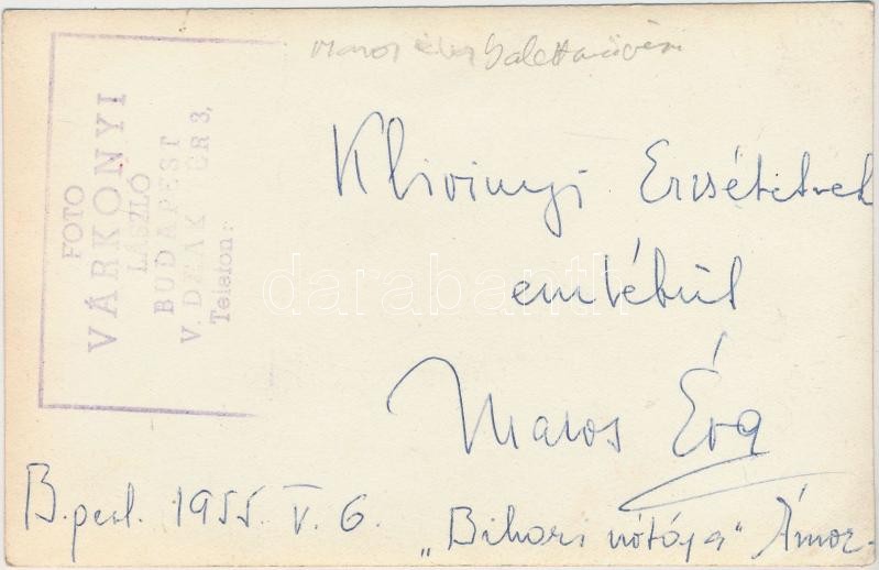 Leírás: 1955 Maros Éva balett táncos aláírása az őt ábrázoló fotó hátoldalán, Várkonyi László Fotó Budapest, sarkán törésvonallal, 14x9 cm