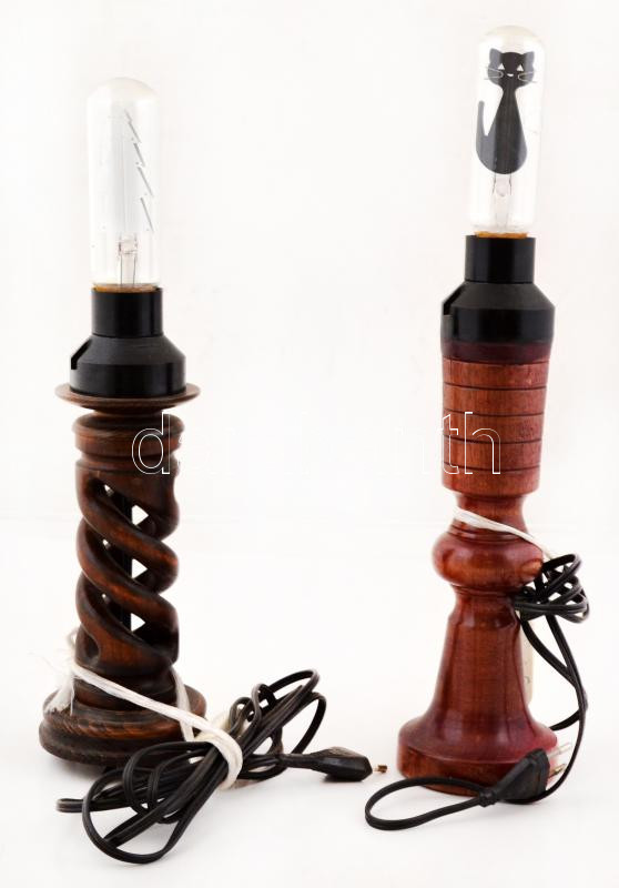 Leírás: Cicás és fenyőfás asztali lámpa, fa testtel, búra nélkül, működik, m:42 cm (2×)