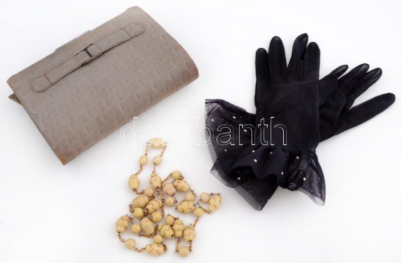 Leírás: Vegyes bolha tétel: retikül (15x21cm), tüll kesztyű, bizsu nyaklánc