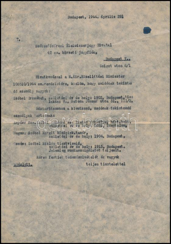 1944 Bp., Zsidónak tekintendő személy nyilatkozata a Székesfővárosi Él... https://www.darabanth.com/hu/251-Gyorsarveres/251.0/Festmeny-mutargy-papirregiseg-egyeb/Judaika~600037/1944-Bp-Zsidonak-tekintendo-szemely-nyilatkozata-a-Szekesfovarosi-Elelmiszerjegy-Hivatal-kC3~II1209494