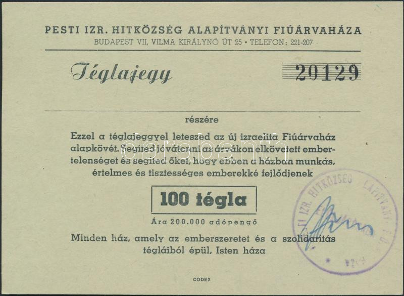 Leírás: A Pesti Izraelita Hitközség Alapítványi Fiúárvaháza részére kiadott téglajegy 200 000 adópengő értékben