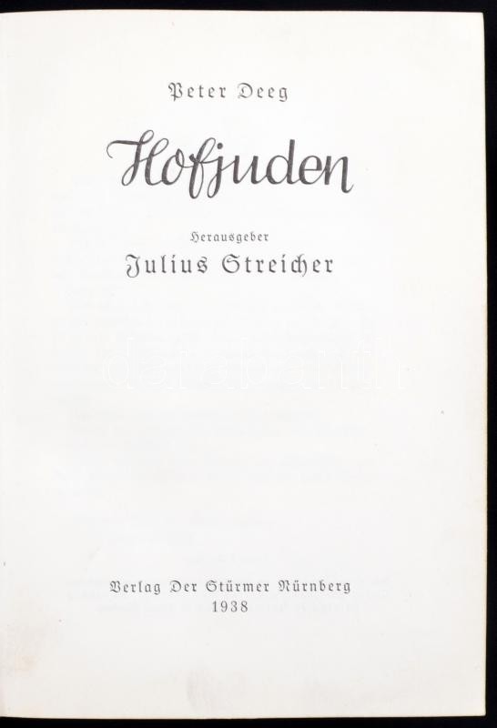 Deeg, Peter: Hofjuden. Hrsg. Streicher, Julius. Nürnberg, 1938, Verlag... https://www.darabanth.com/hu/251-Gyorsarveres/251.0/Festmeny-mutargy-papirregiseg-egyeb/Konyvek-Judaika~600034/Deeg-Peter-Hofjuden-Hrsg-Streicher-Julius-Nurnberg-1938-Verlag-Der-Sturmer-Kisse-kopott-~II1209561