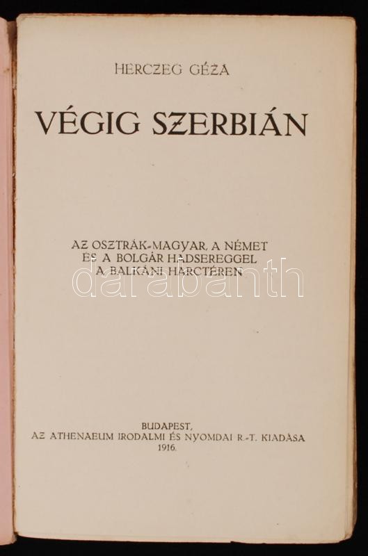 Hercezg Géza: Végig Szerbián. Az osztrák-magyar, a német és a bolgár hadsereggel a balkáni harctéren. Bp., 1916, Athenaeum. Kicsit kopott papírkötésben, egyébként jó állapotban.